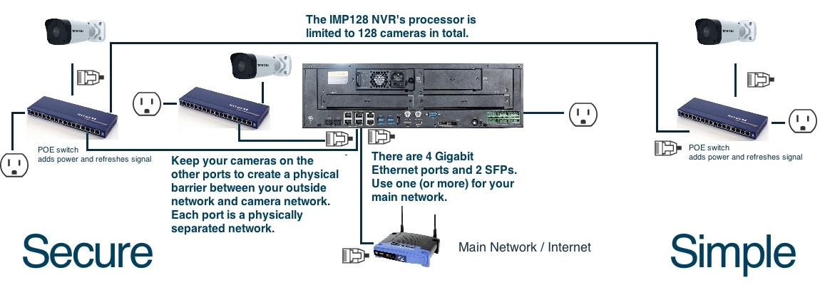 Cyber Security Protections - hackers can't easily see SCW cameras because they run on a special, isolated network created by the NVR. (For more information and a history of some of the larger cyber security attacks that have affected the industry, please see our guide on best practices for preventing IOT hacks.)